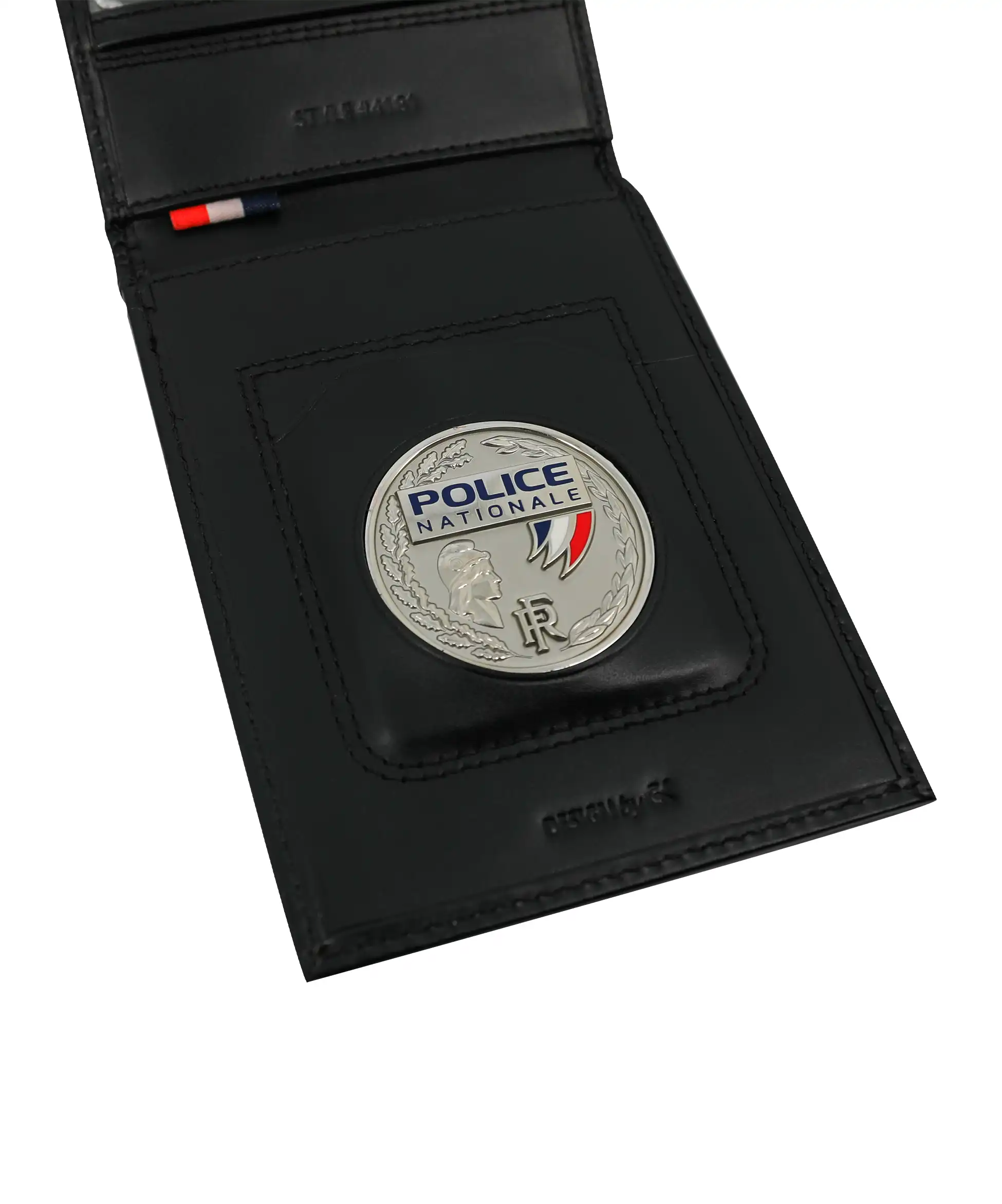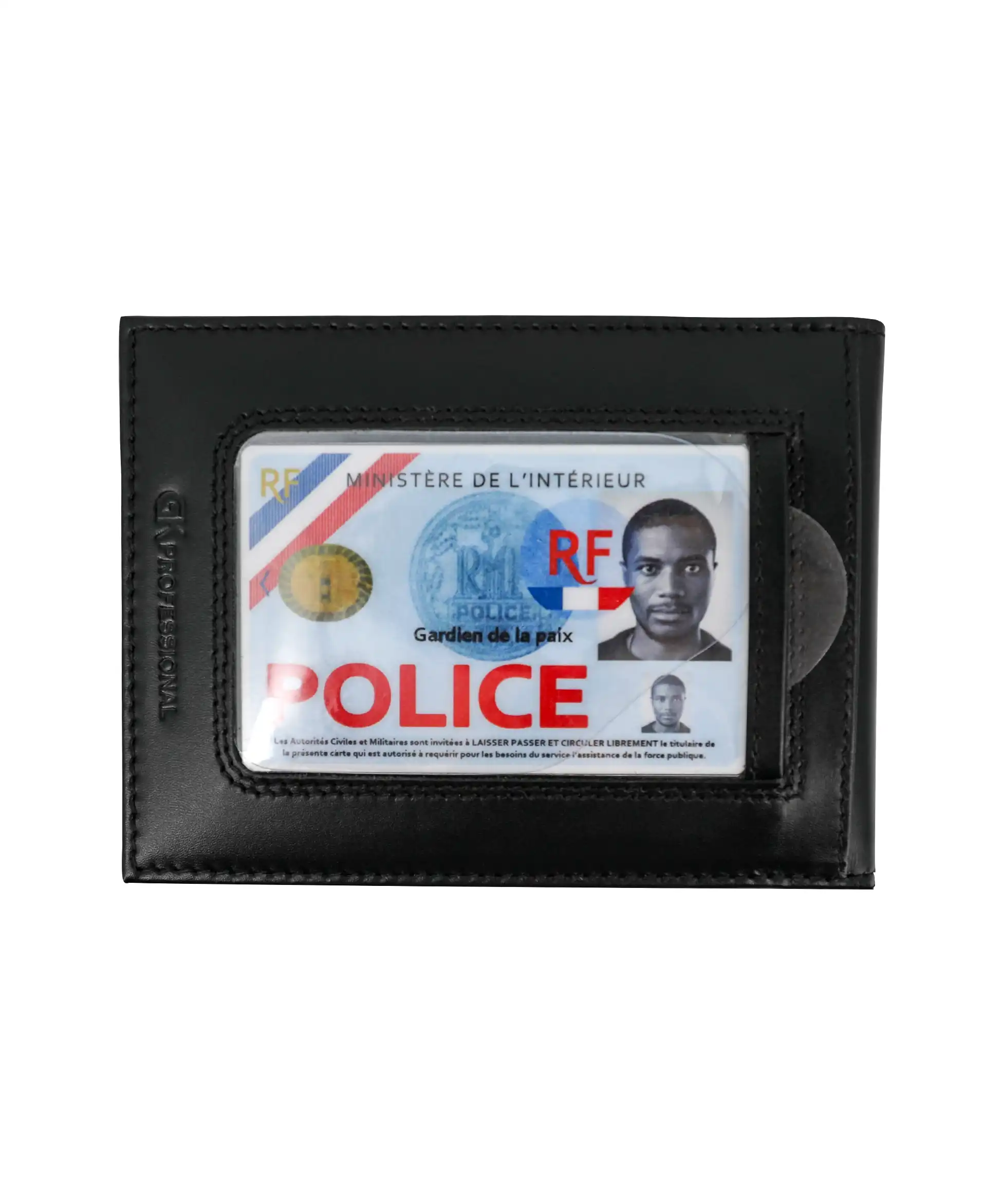 Porte-cartes noir 2 volets avec ouverture verticale, format replié 95 x 130 mm. Intérieur comprenant un emplacement carte (85 x 55 mm), un emplacement pour médaille ronde ou carrée, et deux poches ouvertes. Au dos : un emplacement type carte Navigo et une poche ouverte. Finition double piqûres.