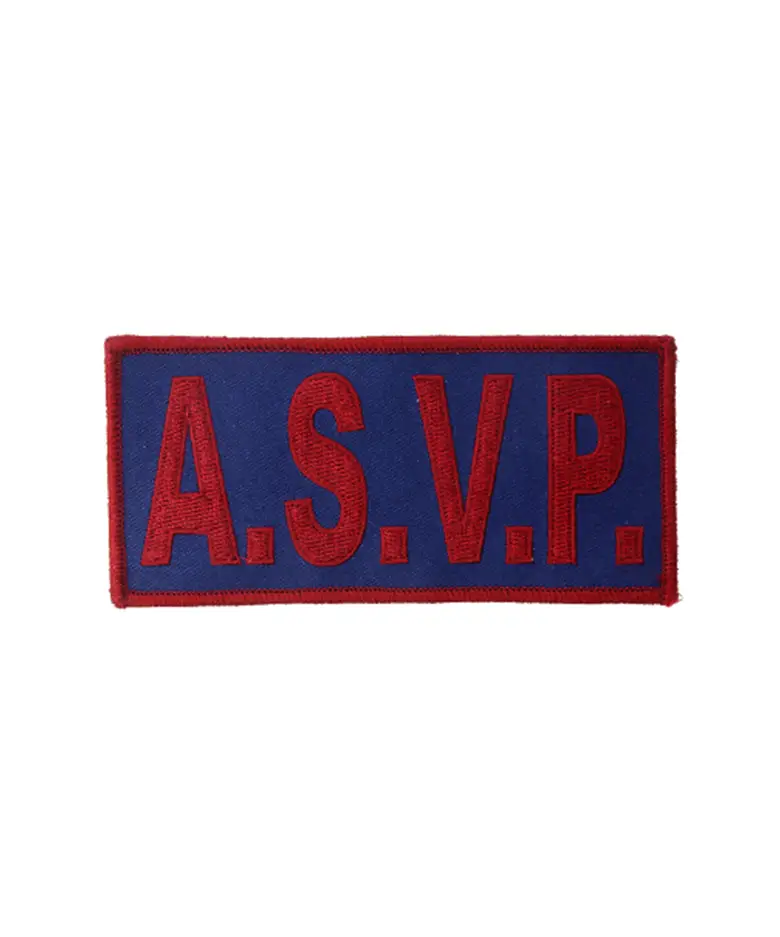 Bandeau ASVP en tissu 13×6 cm, fond marine avec lettrage bordeaux brodé en fils de rayonne. Base tergal résistante, fixation par gripper, idéal pour tenues professionnelles.