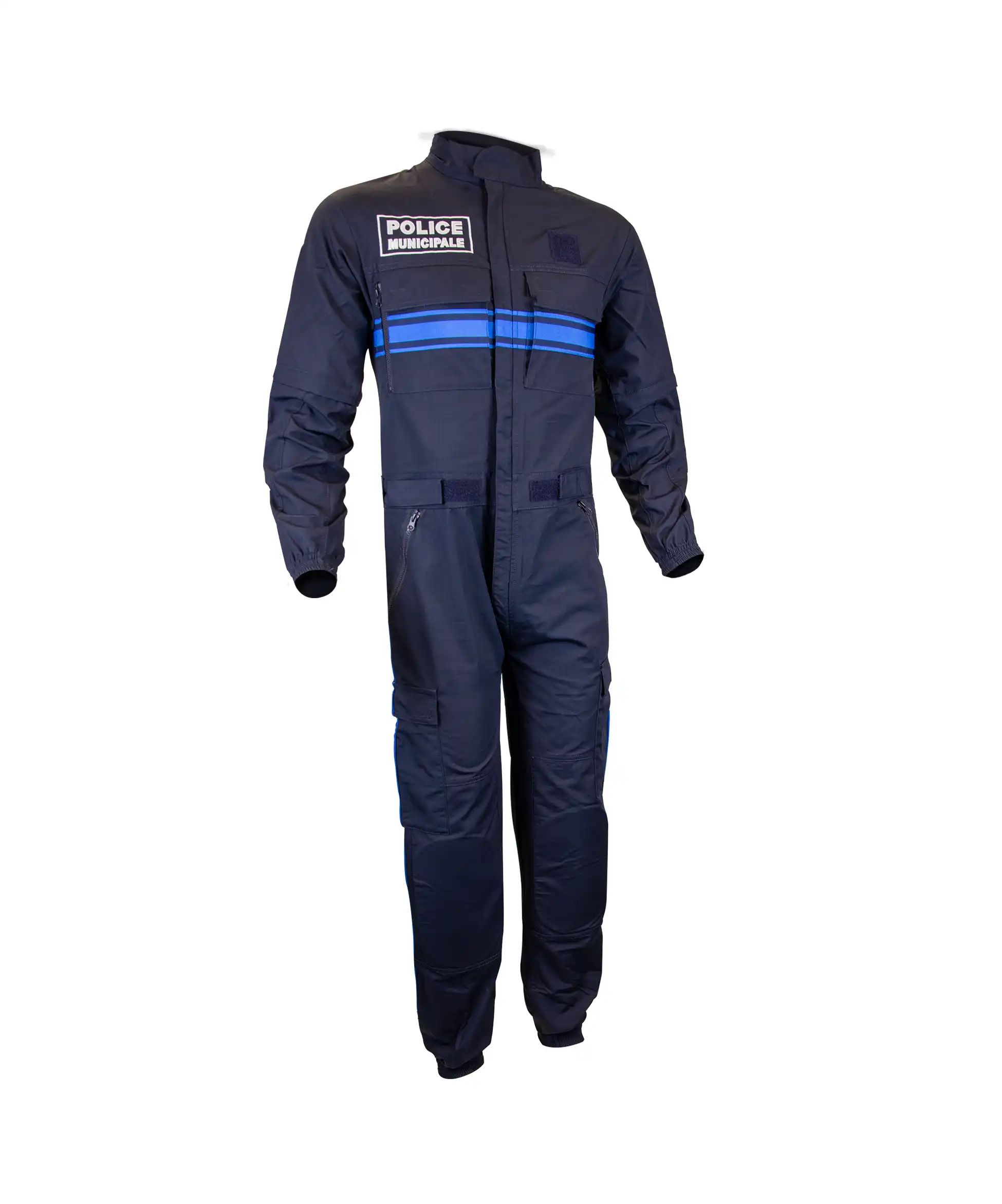 Disponible du XS au 4XL, cette combinaison arbore un bleu Pantone 19-3921 TPG sublimé par une bande et un passepoil bleu Pantone 18-4148 TPG, ainsi que les broderies POLICE MUNICIPALE devant et dos. Elle comprend également un emplacement pour badge 50 × 50 mm et est livrée sans écusson.