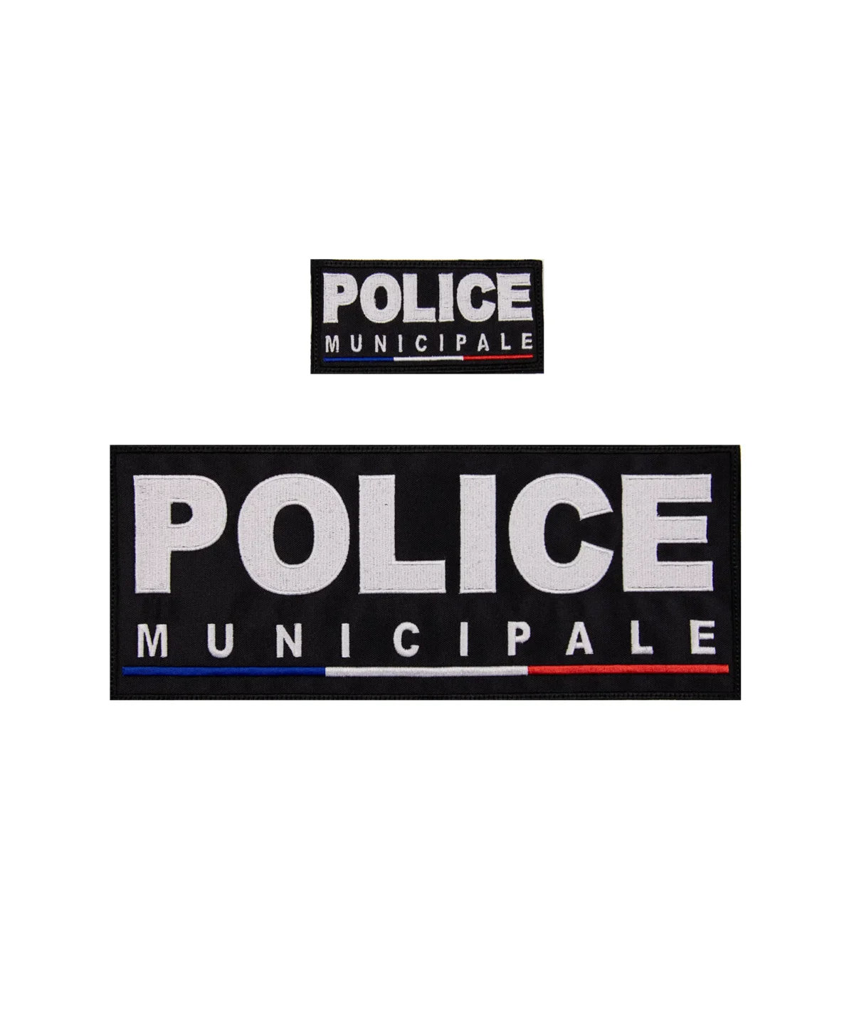 Chaque badge est confectionné avec un tissu sergé en coton noir robuste, orné d’un lettrage blanc “Police Municipale” brodé, complété par un liseré tricolore (bleu-blanc-rouge) brodé également, symbole d’autorité et d’appartenance républicaine. La finition bourdon américain renforce la durabilité du produit, même en conditions intensives.